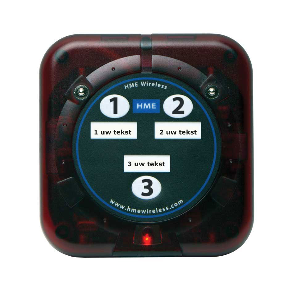 Met deze 3 knops oproepunit kunt u naar één of meerdere pagers tekstberichten versturen. U bepaald vooraf zelf de tekst die door ons in het systeem wordt gezet. De transmitter bereikt de pagers tot circa 150 meter.