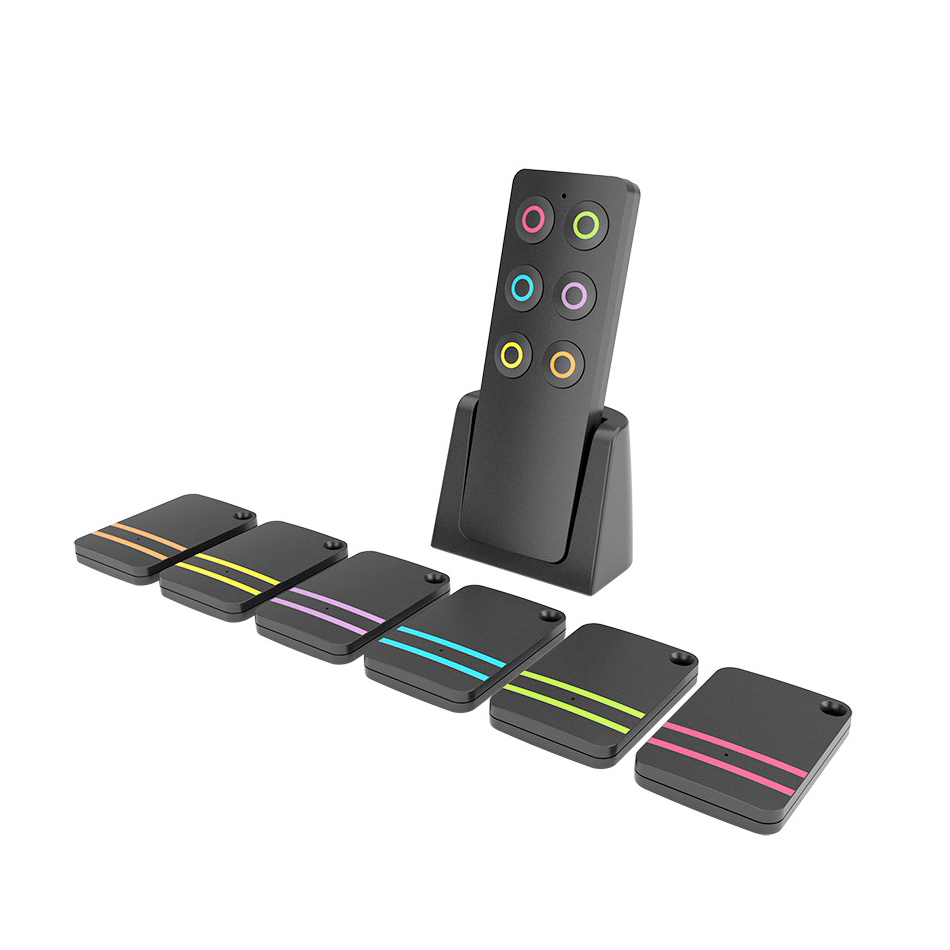 Deze draadloze objectzoeker bestaat uit een 6 knops-afstandsbediening met kleugecodeerde knoppen met daarbij een aantal van 6 gekleurde piepers die overeenkomen met de kleuren op de afstandbediening.