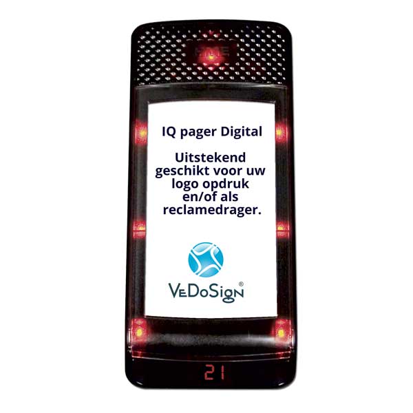 De voorzijde van de pager is voorzien van een transparant venster waarachter u een logo of instructiekaartje kunt plaatsen. De IQ pager is een uitstekende reclamedrager waarop uw logo of het logo van uw leverancier kan worden afgebeeld. Diverse leveranciers van bijvoorbeeld drank en snacks zijn vaak geïnteresseerd om mee te investeren wanneer hun logo mag worden afgebeeld. Wij verzorgen het ontwerp en het drukwerk.